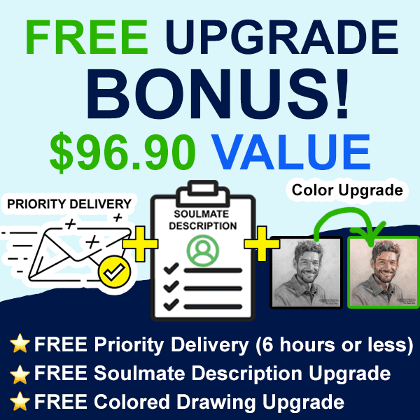 3️⃣ FREE Colored Drawing Upgrade (normally $19.95): See full details, including your soulmate’s features and eye color, in vivid color.